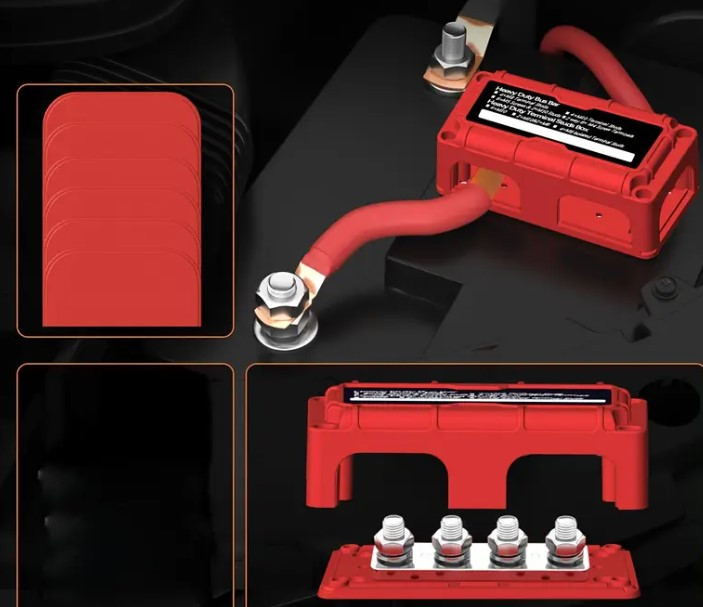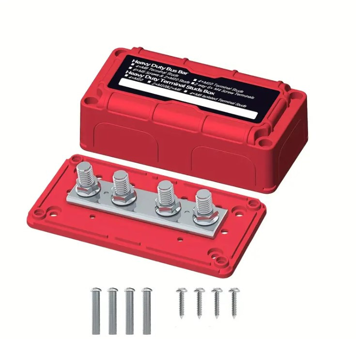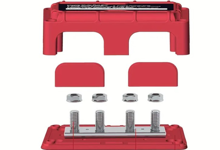 Busbar, 4 pontos soroló sín, közösítő sín + fedél, 300A, 1 pár (piros és fekete)