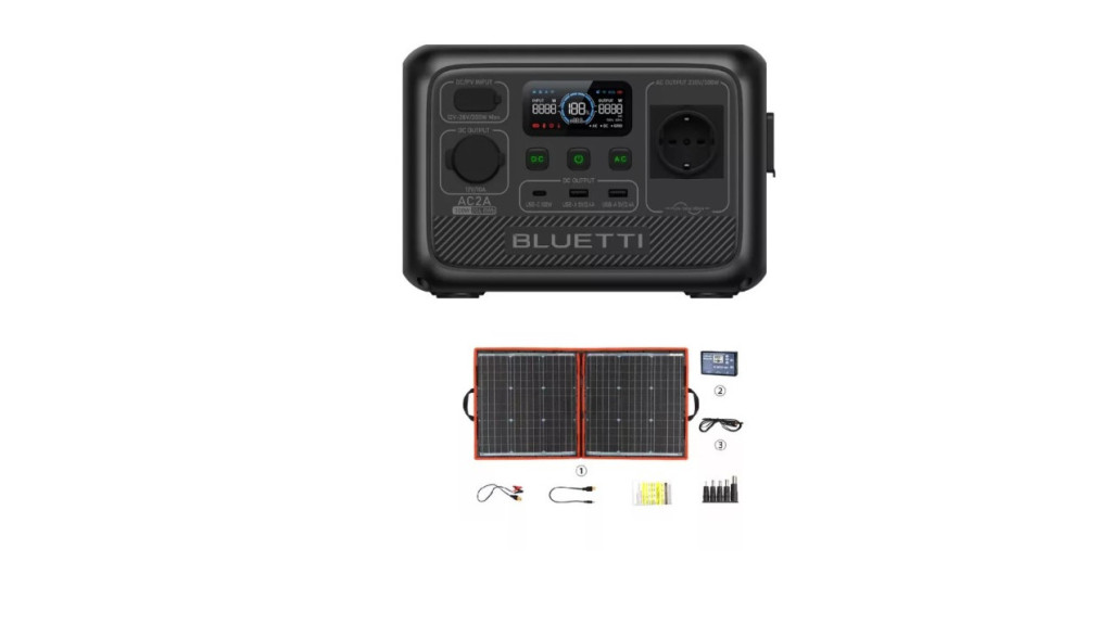 Bluetti AC2A töltőállomás, szolár generátor 300W / 600W , 204,8Wh hordozható erőmű, 100W napelem panel