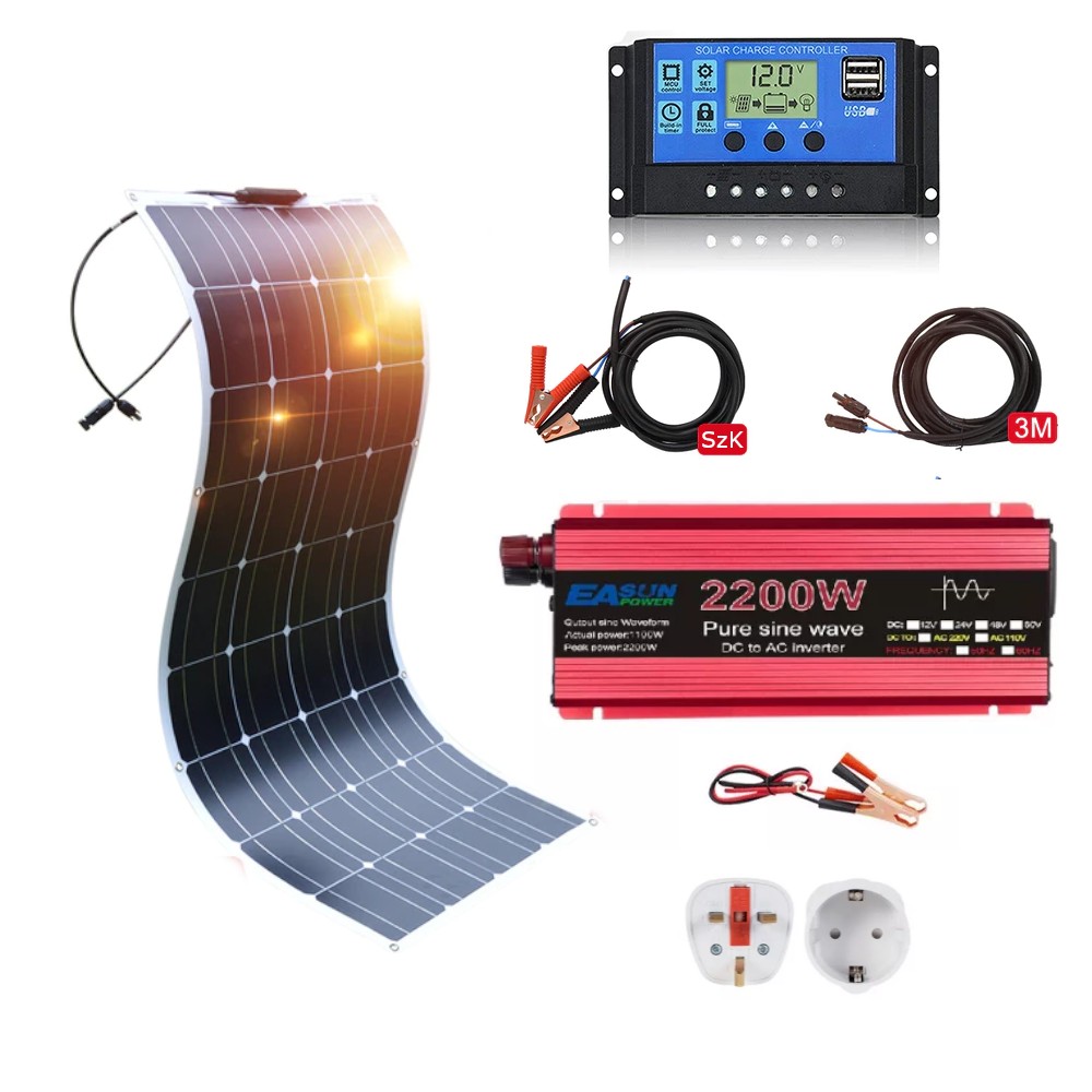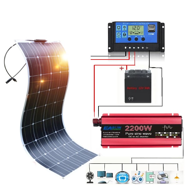 A rendszer alapja a kiváló minőségű 18 V-os flexibilis napelem, a 2200W-os inverter és a 12V/24V 10 A-es napelem töltésszabályozó.