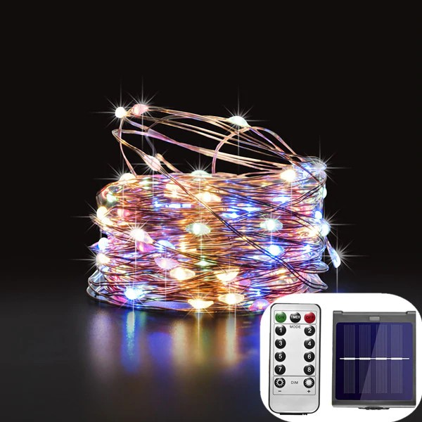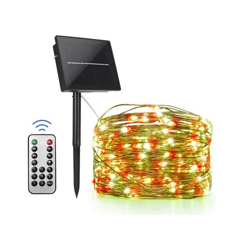 200 db szuper fényes SZÍNES LED izzó, 21 méter hosszú vékony vezetéken, kiváló minőségű napelemmel, kültéri használatra. Vízálló IP65, Multicolor színes LED szalag. Infra távirányítóval.