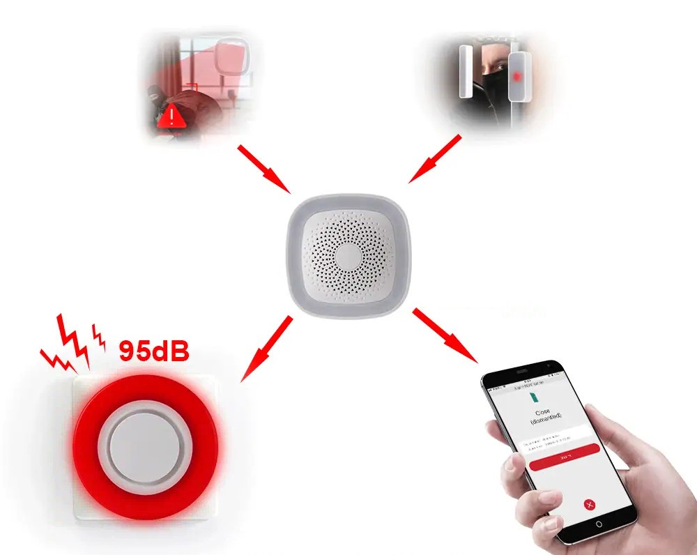 Ha riasztási esemény történik, akkor a készülék nagy hangerővel 95dB erősségű hangot, valamint fény jelzést ad ki. Ezzel egy időben elküldi a riasztási információkat a hub részére.
