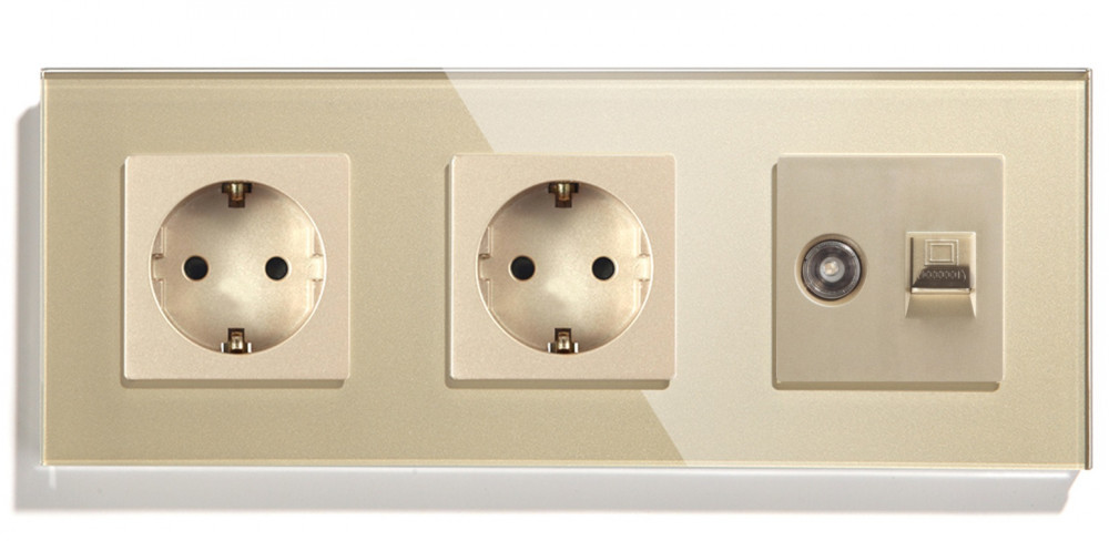 Hármas fali dugalj üveg konnektor és TV+Internet RJ45 csatlakozó, arany, magyar szabvány, Elegant Pro
