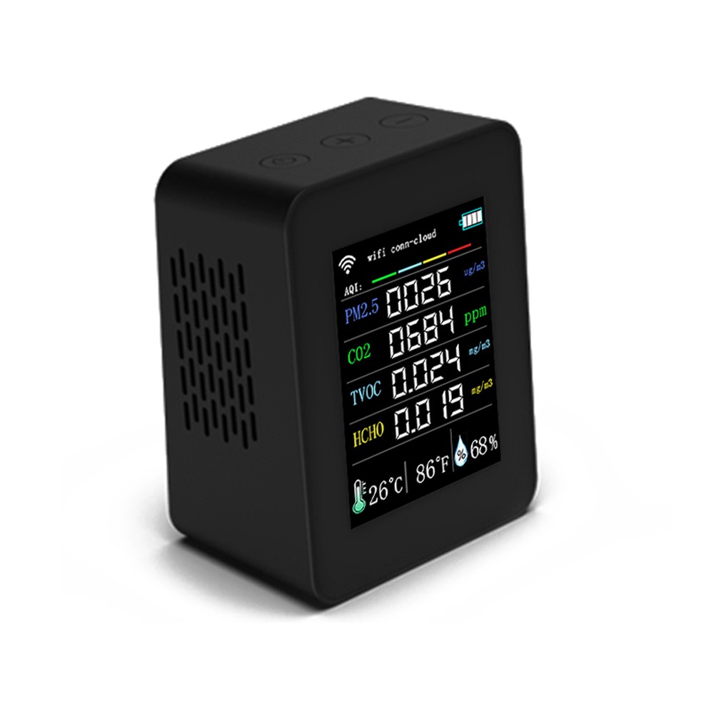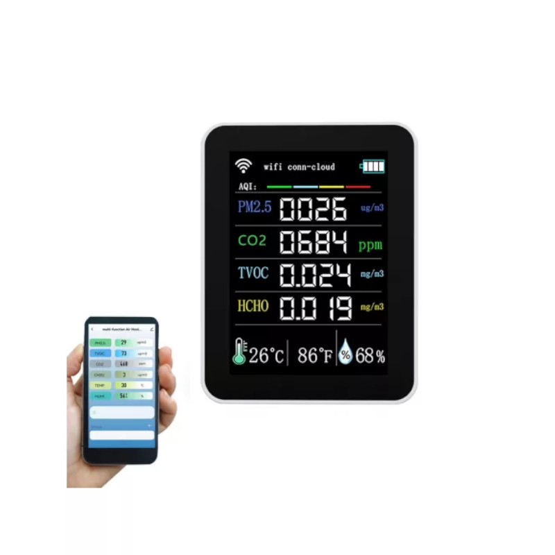 Intelligens figyelő és mérőeszköz, amely képes kimutatni a levegőben a formaldehidet, a párolgó mérgező gázok mennyiségét TVOC értéket, a CO2-t, továbbá páratartalom és hőmérséklet mérési funkcióval rendelkezik, és méri a káros por PM2.5 értékét is.