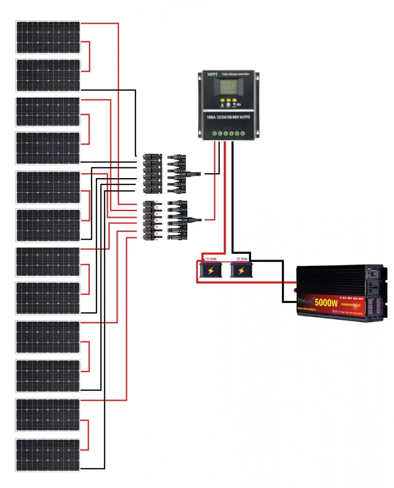 The main parts of the solar system are the 18V 1000W solar cell, the 12V/24V/36V/48V 100A MPPT battery charge controller, the 5000W Inverter, the connecting cable,