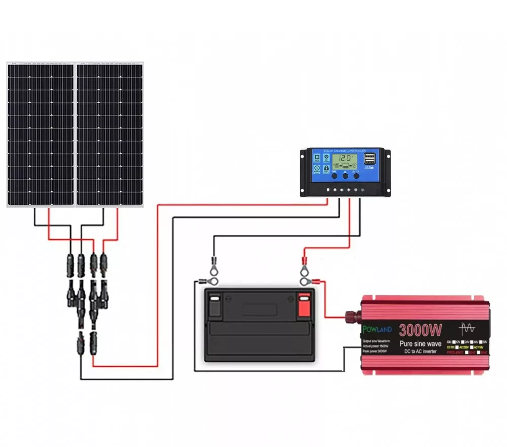 The main parts of the solar system are the 18V 200W solar cell, the 12V/24V 10A battery charge controller, the connecting cable,