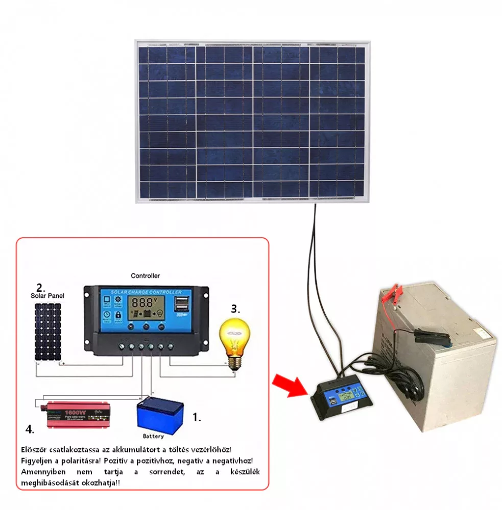 The main parts of the solar system are the 18V 40W solar cell, the 18V 40W battery charge controller, the 1600W Inverter, the connecting cable,