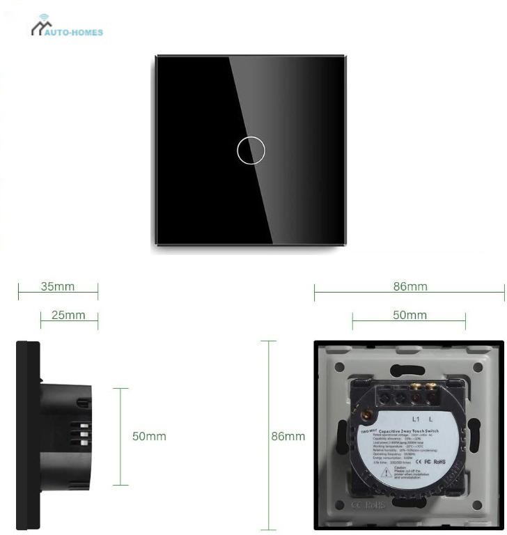 Power Source: ACVoltage: 240VSwitch Type: 2 wayPlug profile: Wall mountSwitch style: Touch switchWeight: 161gNo Neutral WireSize:86mm*86mm*32mmTempered crystal glass.