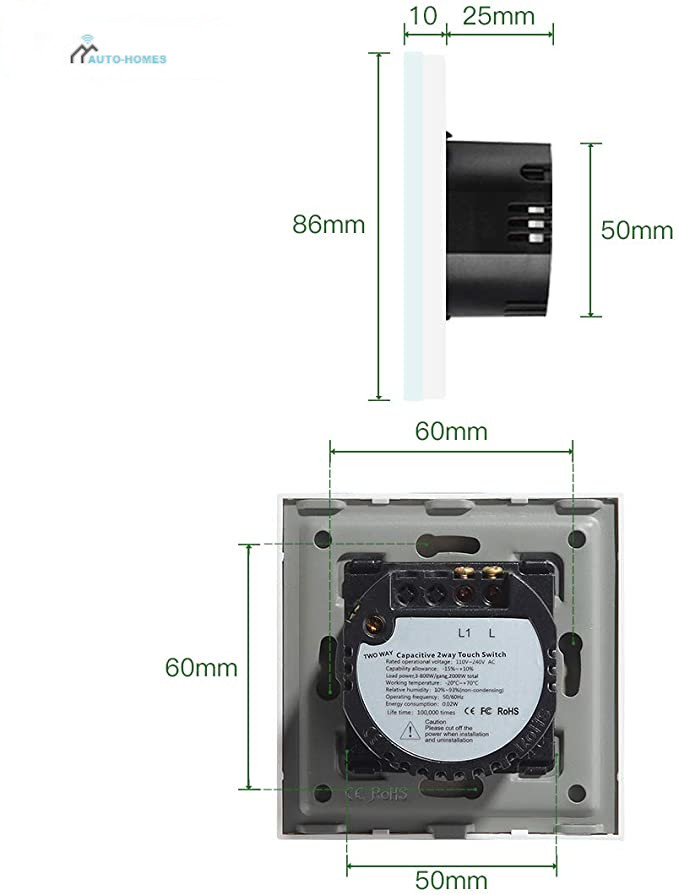 Power Source: ACVoltage: 240VSwitch Type: 2 wayPlug profile: Wall mountSwitch style: Touch switchWeight: 161gNo Neutral WireSize:86mm*86mm*32mmTempered crystal glass.
