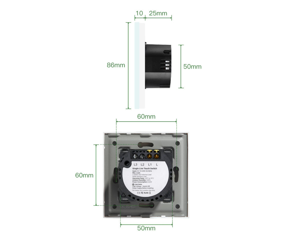 AC 100V-240V, 50/60HZMaterial: ABS+PC, tempered glass panelSize: 86mm*86mm*35mmNeutral Wire Required: NoColor: White