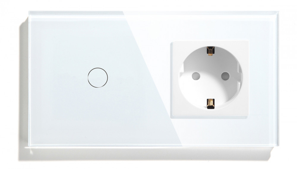 Touch Light Switch 1 Gang 1 Way and Socket, Tempered Glass Panel Light Switches with LED Indicator 86mm White Touch Sensitive Light Switch-No Neutral Wire