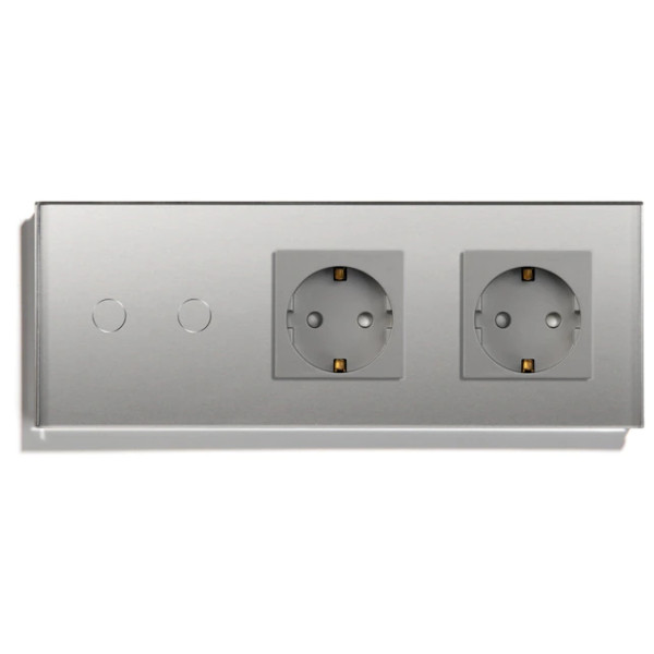 Elegant Touch Light Switch 2 Gang 1 Way and Dual Socket, Tempered Crystall Glass Silver Touch Sensitive Light Switch-No Neutral Wire.